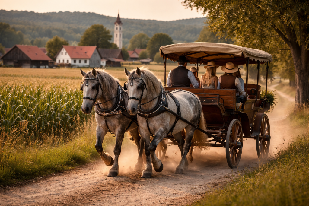 Vratite se u prošlost i doživite čarobnu vožnju tradicionalnom konjskom zapregom kroz vinograde i netaknutu prirodu, uživajući u miru, krajolicima i autentičnoj atmosferi vinarskog podneblja.
